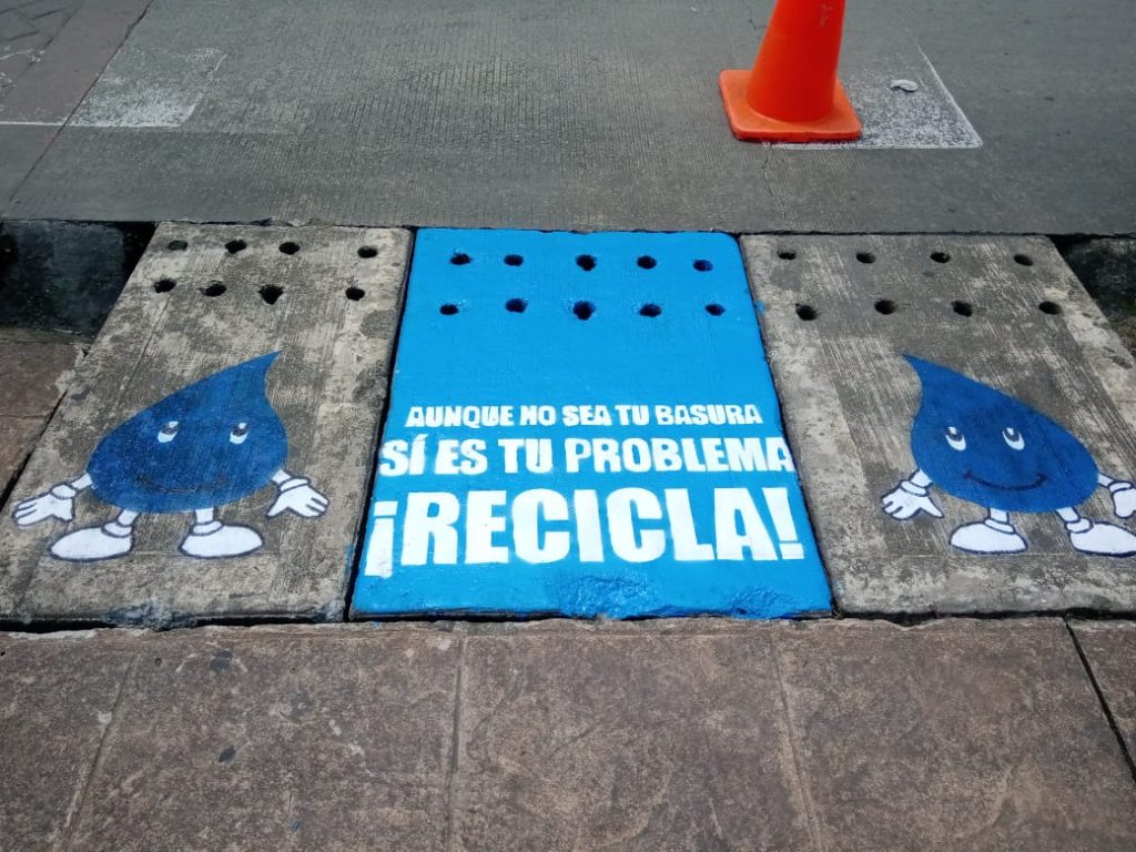 La jornada continuó el día sábado en el Boulevard, donde también pintamos los sumideros con el mensaje: ¡Aunque no sea tu basura, si es tu problema, Recicla! acompañada de nuestra gota institucional.