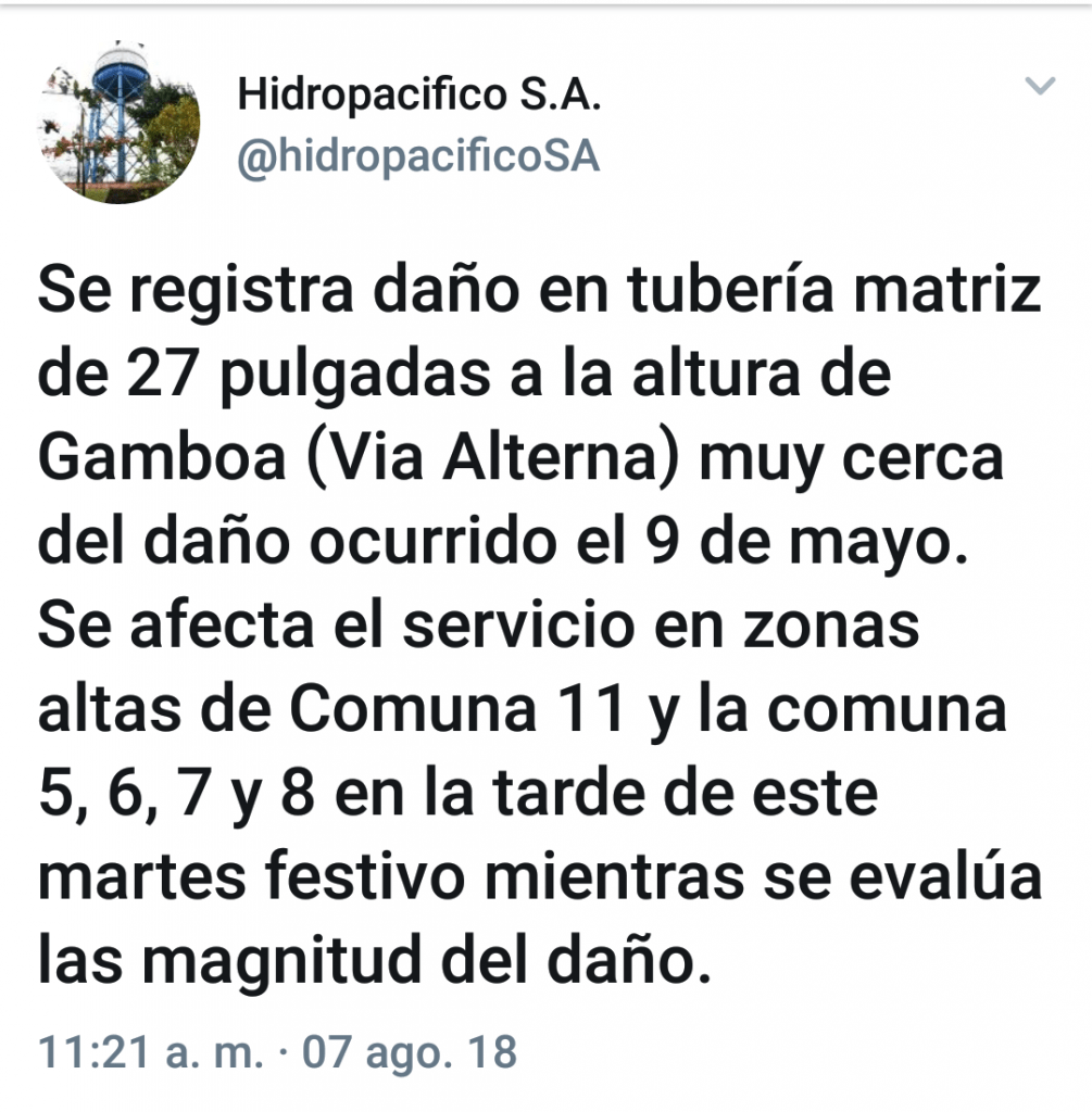 Informamos a nuestros Usuarios que se registra un daño en la tubería matriz de 27 pulgadas a la altura del barrio Gamboa (Vía Alterna), muy cerca del daño ocurrido el 9 de mayo de este año.