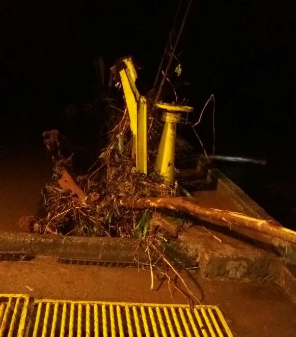 Mientras tanto, Operarios de la empresa trabajan desde muy tempranas horas en la limpieza y remoción de todo el material rocoso y forestal que taponó la bocatoma principal con la fuerte creciente del río Escalerete, en la noche de este miércoles.